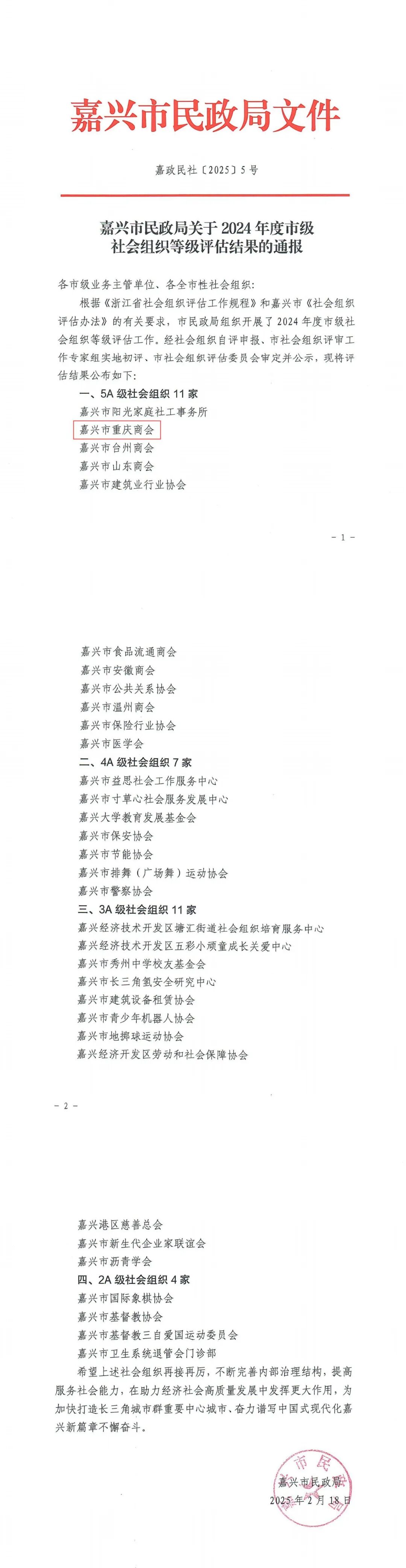 根据《浙江省社会组织评估工作规程》和嘉兴市《社会组织评估办法》的有关要求,嘉兴市重庆商会精心准备,申报5A级社会组织评估,现经市社会组织评审工作专家组实地初评、市社会组织评估委员会审定,嘉兴市重庆商会顺利通过5A级社会组织评估。这是上级对商会综合实力及工作成效的高度评价和认可。