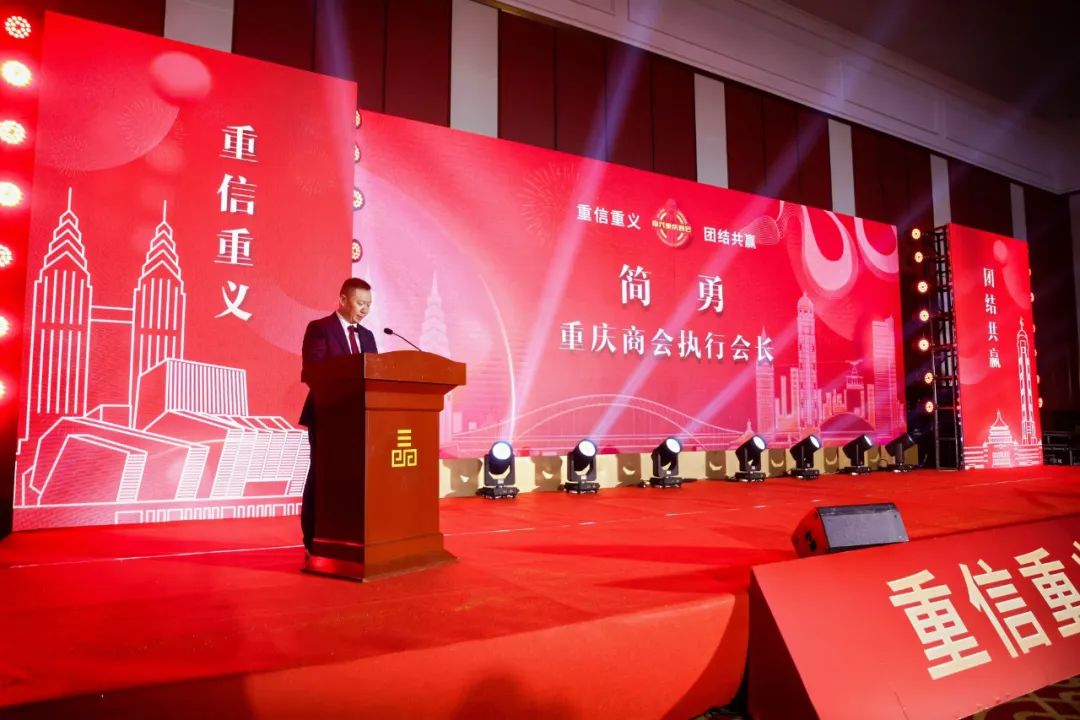 执行会长简勇为年会晚宴致迎宾辞,他对一直以来关心、支持商会发展的各位领导、各兄弟商会、在禾渝籍乡友和全体会员表示热烈的欢迎和由衷的感谢。他表示,过去一年,商会在党建引领中把准前进方向,在深化服务中提升工作能力,在协调大局中展现渝商担当,在公益善行中传递大爱情怀,商会凝聚力、向心力持续提升,会员企业队伍不断壮大。在新的一年,希望所有会员携起手来,团结一心,在经营好自己企业的同时,为商会这个大家庭的健康发展献计献策,相信通过我们的共同努力商会一定会越办越好,为在禾重庆人增光添彩,为社会的繁荣稳定做出更大的贡献。