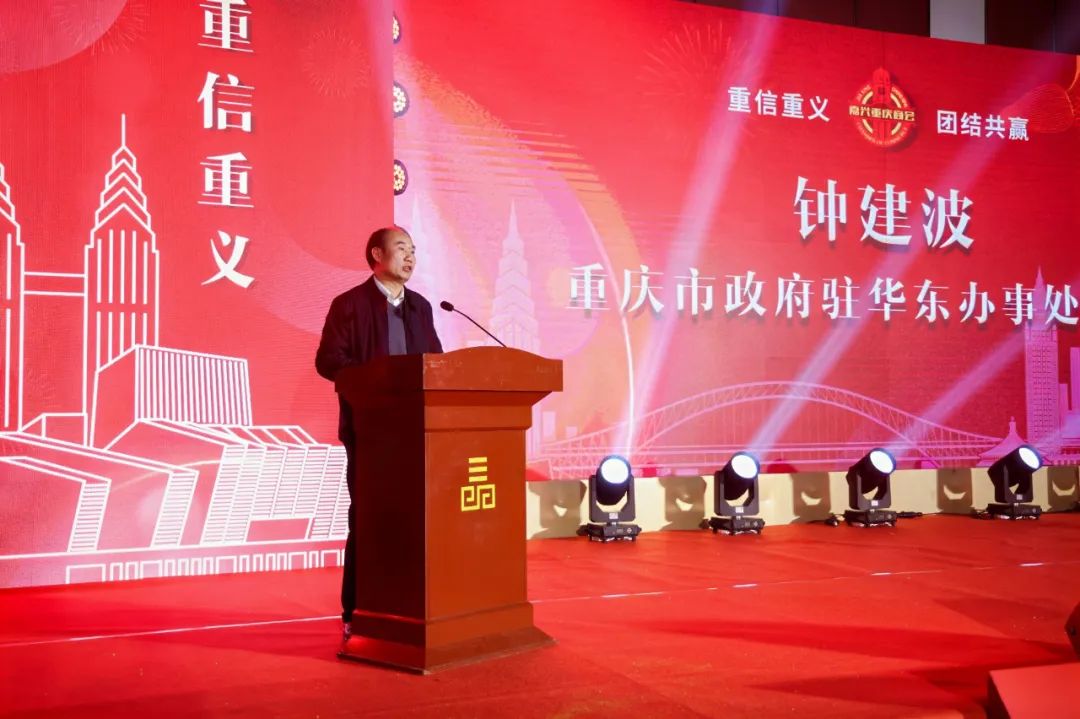 重庆市政府驻华东办事处主任钟建波致辞,他对商会成立以来在推动禾渝两地合作交流、完善内部建设、服务会员、开展社会公益等方面取得的成绩给予了肯定。在未来发展中,商会要发挥好平台作用,顺应新形势、新任务、新要求,在两地政府的指导下,在领导班子和全体会员的共同努力下,始终不忘初心,把握机遇,接续奋斗, 以实际行动承担起渝籍企业家的的社会责任,实现民营企业高质量发展,促进禾渝两地进一步的合作交流,推动商会工作迈上新台阶。